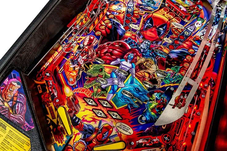 Stern’s Deadpool Pro, Premium, and Limited Edition models feature stunning and distinctive hand-drawn art by renowned illustrator Zombie Yeti. Well known actor Nolan North stars as the eccentric voice of Deadpool. Each game features a 3-bank drop target with a ball lock that’s guarding a custom molded Lil’ Deadpool bash toy target. In addition, all models include two stainless steel and wireform ramps with a Katana Sword ramp return. Deadpool pinball entertains with an amazing array of ninjas, vampires, and chimichangas, making it suitable for all skill levels.